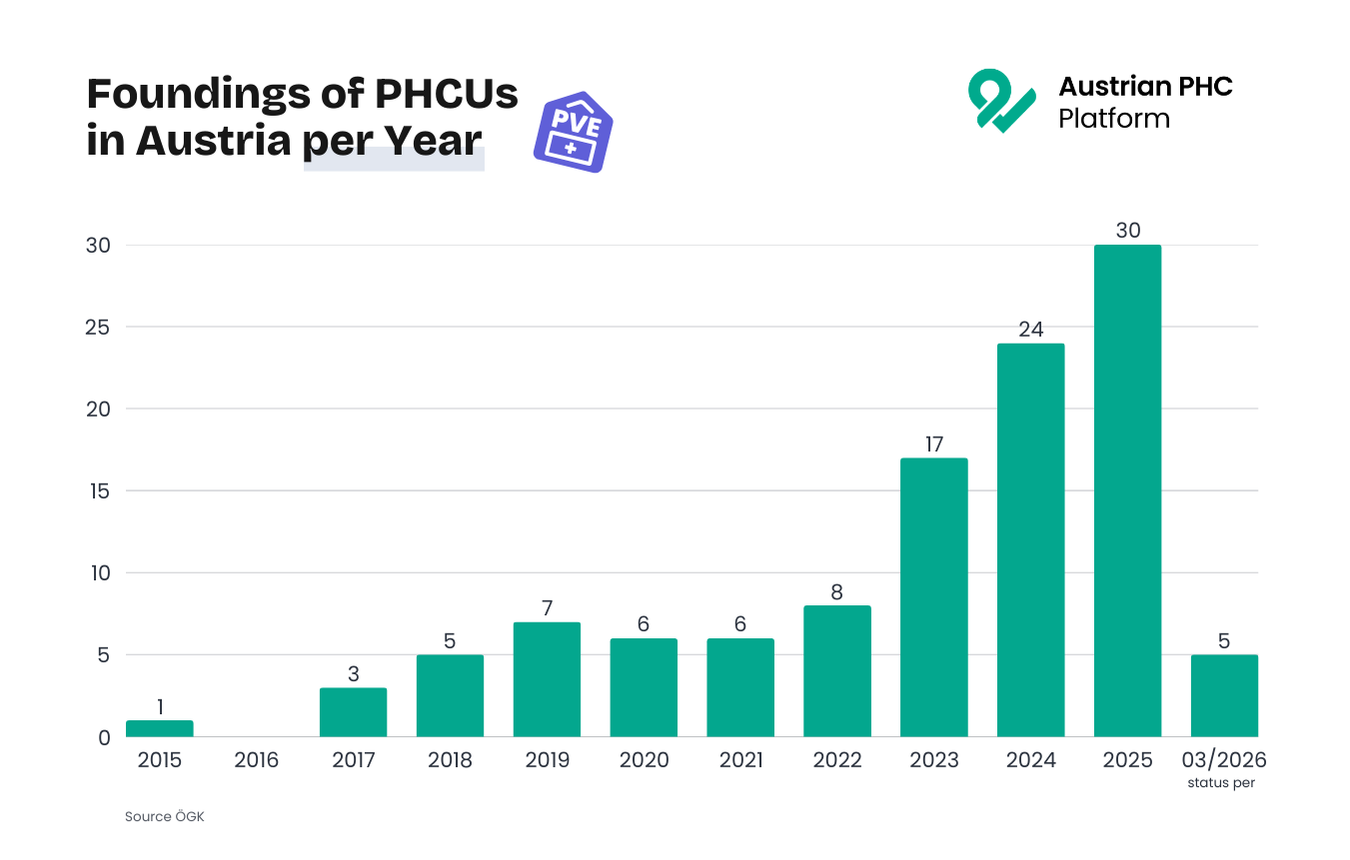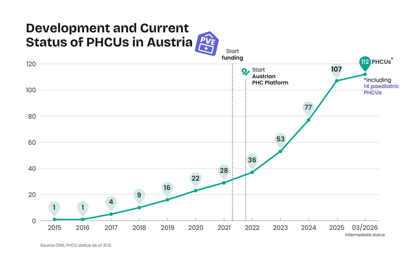 As of March 2026, there are 112 primary health care units (PHCUs) across Austria, including 14 paediatric PHCUs.