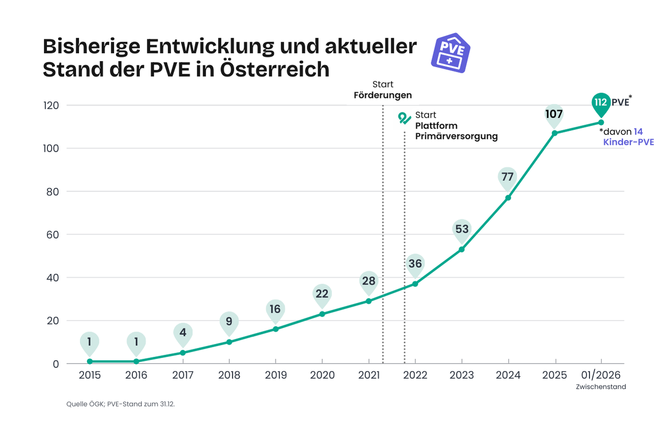 Mit Stand Jänner 2026 gibt es österreichweit 112 Primärversorgungseinheiten, davon 14 Kinder-PVE. Eine interaktive PVE-Landkarte zeigt die aktuellen Standorte aller PVE in Österreich.